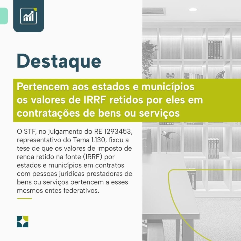 O Supremo Tribunal Federal, no julgamento do RE 1293453, representativo do Tema 1.130, fixou a tese de que os valores de imposto de renda retido na fonte (IRRF) por estados e municípios em contratos com pessoas jurídicas prestadoras de bens ou serviços pertencem a esses mesmos entes federativos.